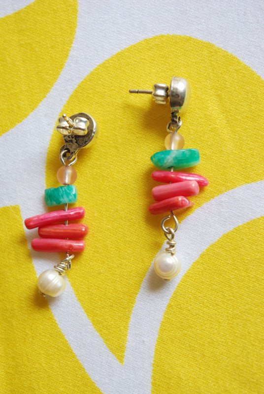 Chips de Coral y Amanzonita verde, bola de Cuarzo Cherry claro y puequeña Perla cultivada, enganche circular de Zamak.